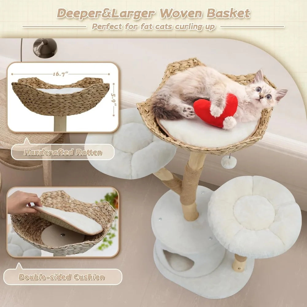 Modern Cat Tree Tower, Solid Wood Multi-Level w/ 2 Flower Perches, Scratching Post, Hanging Ball - Luxury Boho Cat Furniture