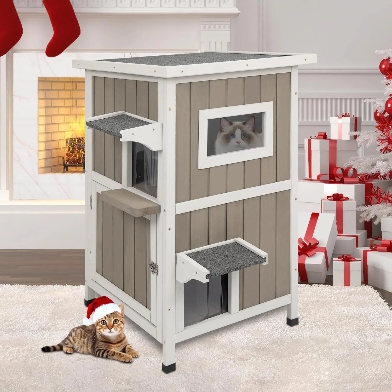 【THOUGHTFUL DESIGN FOR CATS】A cat house outdoor ideal with create a functional and inviting environment for your feline friends! A wider transparent window at the 2nd floor, besides, the essential escape doors addes the 2 story cat shelter house, which is waterproof with high legs and sturdy instruction even at the grass. Elevated legs keep the house off the ground, offering a sense of security and helping to prevent dampness.
